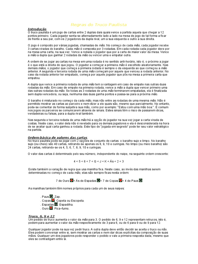 O truco paulista é um jogo de cartas entre 2 duplas dais quais vence a partida aquela que chegar a 12