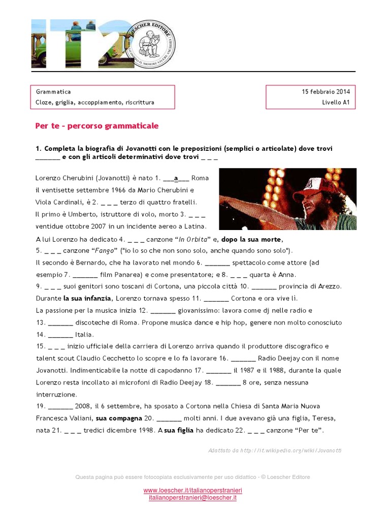 1. Completa la biografia di Jovanotti con le preposizioni (semplici o articolate) dove trovi