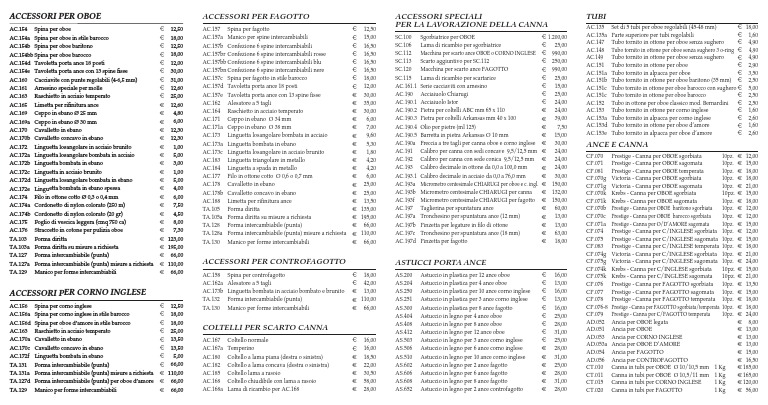 TA.129 Manico per forme intercambiabili € 66,00 AC.158 Spina per controfagotto € 18,00 AS.200 Astuccio in plastica per 12 ance oboe € 16,00 CP.075k Krebs - Canna per C/INGLESE sagomata 10pz. € 21,00