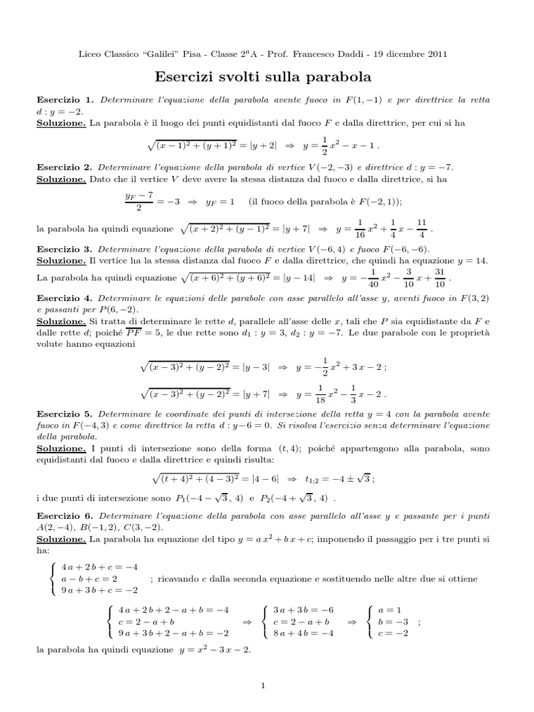 Esercizio 7. Determinare l’equazione della parabola con asse parallelo all’asse y, avente vertice in V (2, 1)