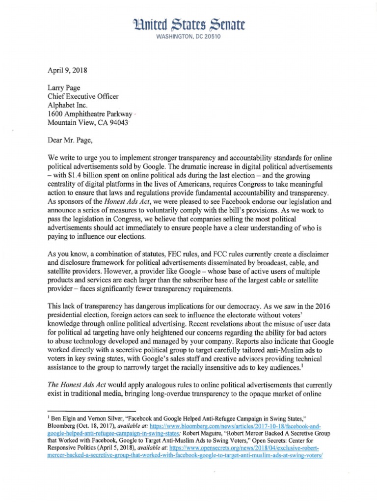 U.S. Sens. Mark R. Warner (D-VA) and Amy Klobuchar (D-MN) today called on Twitter and Alphabet, Inc., the parent company of Google, to implement stronger transparency and accountability standards for online political advertisements.