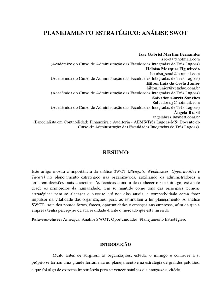 Palavras-chave: Ameaças, Análise SWOT, Oportunidades, Planejamento Estratégico.