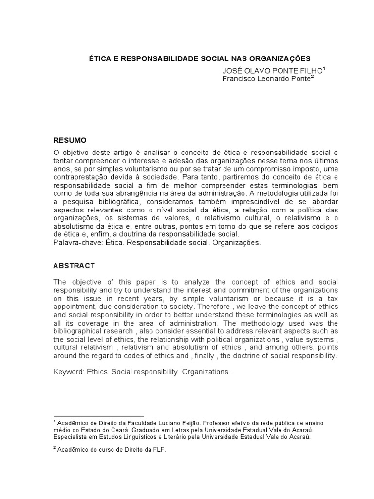 O objetivo deste artigo é analisar o conceito de ética e responsabilidade social e