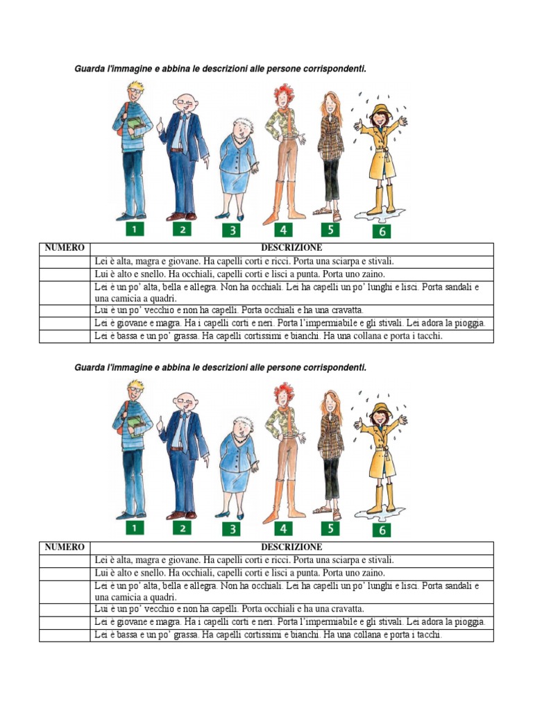 Guarda l'immagine e abbina le descrizioni alle persone corrispondenti.