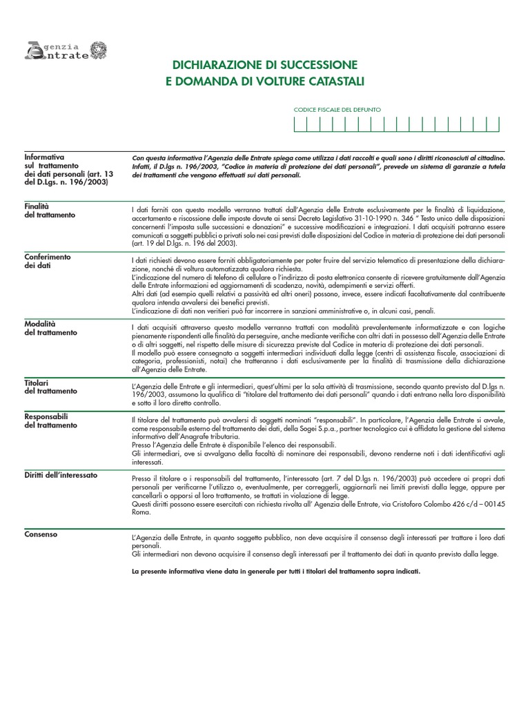 concernenti l'imposta sulle successioni e donazioni” e successive modificazioni e integrazioni. I dati acquisiti potranno essere