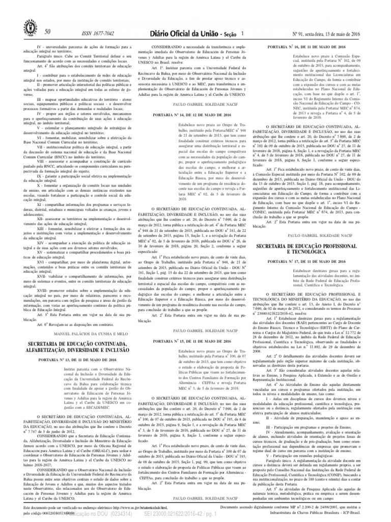 outubro de 2015, página 9, Seção 1, e a revogação da Portaria MEC