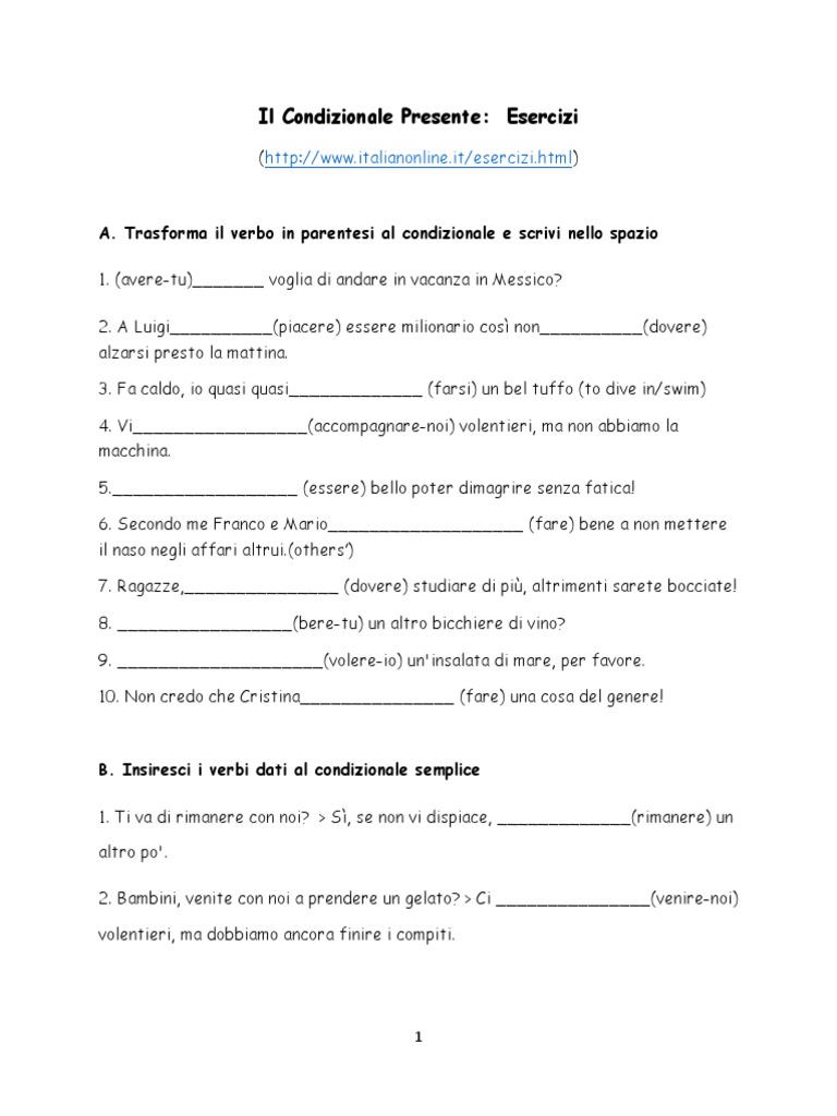 A. Trasforma il verbo in parentesi al condizionale e scrivi nello spazio