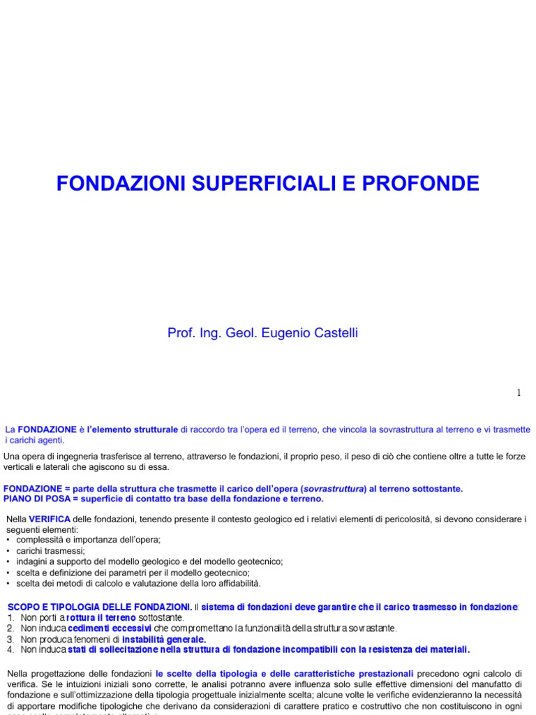 • fondazioni profonde quelle per le quali il carico è trasmesso al terreno con la pressione sotto il piano di appoggio e per attrito