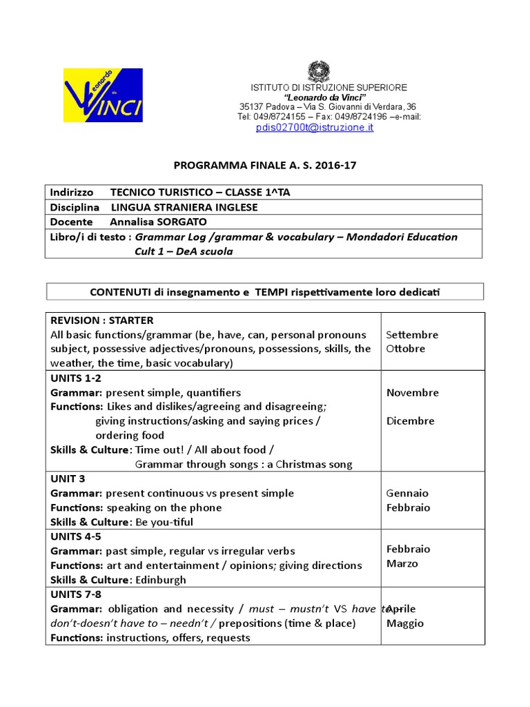 Indirizzo TECNICO TURISTICO – CLASSE 1^TA