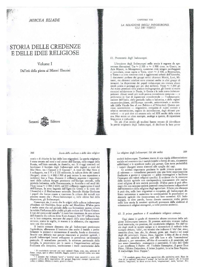 MIRCEA BLIADE STORIA DELLE CREDENZE E DELLE IDEE RELIGIOSE Volume I Dalled della pietra ai Mister! Bleusini swuort ABE Ese LA RELIGIONE DEGLI INDOEUROPEL ‘GLI DE! VEDIC 2, Proostoris det Indocarope Liione dept Indoessope nella stoca 2 angoata de sox entogedstusion Tra ~'2 300 « %0 1900 cia, in Grea in 1st Minore, in Blsopotamia namerose ith vengonsachepite Sncendite, coo cain a Toa, vero ®*2 500, a Beyceslan, STano en die toctnm ct tplomera utes del Aantle 1 doeameat pana de grt etnies chia Hitt, Lisi, Mi {ann lament agaont sano area ance in sl grup imoaer. La disprsione dei opal indaetope ea itis sunt Secll pia prepa pol per doe ment Verso %! 1200 lt. Deana pene ela pars insogangee, gt Til seer ‘osiadatlidoente Bey I Grecia ele ioleerno indore. Deiste Alcan seek pi tnd pte consider Davonena in se i espansone consdeevale $e dl'inda, dle penaols dale bless Ceputodanubiane, cell Evropa sentale, steioale sedan tale dala Viole fio al rar Balico e PA). Queso po ano arnteistico — migrnione, congue d)nuovt teen ‘lave secominione, sags di teimdanon, deg abitant pre fees — ol pes fe Ney fit on he po, ag «que, eine a it. un scalo ali dios! hanno certo dh Kei a pain erginia deg Tadoeuope, deta la loro peo208 Shore dete rene dele ee reo sori chase le ft ele loro mignon, La pti origharia rata carats el nord e oe ene dell Exvop, ole steppe dalla ‘Rosia, el Ania cmv, in Antlis, o.5 © ogg conc el foclasre I Yori deg Todberope nalle veil 2 nord dl Mer Nev, st Caren et Caces', A nord Gel Mar Neo st 2 suloppin, tea tWe 1 millenia cara det dt toms (larger yeso 4 0003 300 pub aa la ata canon + tcl ne 2 Ties Ducat fillers sponte taper Sant dee clara larger genewano sel arepecenak walla eivol blanc, alle Terenas, in Ano ¢ nl nord de Fan (cuca 3 3003 GOD), rl FI mille tagungoo mond self Earop, la aoa grata dll gen Cin recs cont el TAnmeln) ¢ i Medieres onerae. Secondo Maria Ginbutr i popol he hanoo erst taomese I clea el tual an ono exes che | Prot lndocurope! , ele time fr lla pertone, gl Indocurope “Comunarsin, 2 ert ce eon dell slr ndocuropea sonnel Ney Tne web al en, Dl pe F anche eto che el peri dale wes formasore quent ears hy rbteFntuerse del va gi pt volar del View Gren {vee del exroe del mecalo' © sat loro ten dee clare detV Ania i cra deta Kero Ares) Nel 1 sles ln 1 Inv compar, merit dt pop dela soon baked termes tate in sgl, n mato © in aay che apps. tan una de edie 1 Temi comune dimers che gh Tadooropel pesiwano Fegiols lerano fl becane (fm ache beads e poor ‘mene fe peor) © conoscerane il eel, bade 0 domes, ‘Benché nan abla ml posutornoncre spre apo pall indecaropel ron! silat a preelcn n'ont fastonle I) momacismo. parle, ia store. patient dl Femi la propensone per le aii « Forgissions eiltge Fratzaa atl engus,ontoseono | ttl carter delle 1 repos deg Indovaropti, Gi dvi =» soci indoeropes: Trove ice i une iid difereminsone {Gale nelenetr orl (embe «form de siccamente ‘Skate le sepature molto piper, Cn srt prob ‘Framol (argon crano iierved alle spoglie dete "G seird inpermte precore igual ira guest po 4h linens = natin pasos eon op fre orgieone fasion x gue conlse — abba Incoregia «faites Fp resp se Bee i et enced aga na cotoponioro ieumete le spi ‘Soi telus tune sess pte: Diskeaprte po ae inre Cheon clsanssocel pastoral complement ndpendent Gileconomin edna rdgtone dol actor I fate pa rleacte Spero chy aul loo migresion« eonqite, Indoaropel a inte tucmco ¢ saint io cntinumione le popalasoni = dene rene che Inconevans al loro carne, Git Indo. Stops, frsive pura: hanno’ dowto cover malo pres Sal Too wos tension! spiel provorte dal sinblo ‘omen! igh! trope vole prin anti 62. 1 prim. punto ¢ # wocsbauriorligiro comune. ug same in od eon neue db Thdorstepea comune. $1 ponsone ans riware oe Eon scm, na precios, da veal rlipons Fin lint Ho dep sal in gusto cnpo fremont aia indo hops dea, cl nel fin che indica i'd (at dear, Stratin doo, an. dv deur, gem. amet) nel ae tga at peinipae Daur, Zour Tapper. iden di dio sven ie is snr lao ale al “tanner (chess), por tntensine, lifer di roranta e dh cretth, pe to sens medion cosmegont patemia). 1 (2o det) Cleo [et mene Padres oe Pindito Dai eeco Zeus ‘be, itien Daipcre, nino Joppitet fo tn Ze Peis, Wesiotine210 Sr dl redone dl er rio ‘al momento hele erfanie clea smestriche rivet avimporana para an sorprende fo den cet nero G2 sano desig dal nome del ono: ger. Dont, Tho, fete Twang (Tanaan), bak. Peas, pasta Peru, ee, froable che git in epoca indocurope io eel ed’ — Uo ptm perc crete dl mondo ecrpmonate—eedowe pase dle tee putin Ege tren nella ota dell: Thsots che snore dl TRinine titnato denne exes. Tl cto del foo & aia tin lento cree delle elon undoeuopes: I nowe Sang ve aa uta age ‘no mgm, melo savo ako ogni, Pease anche ropprce che {To tlie cexpune ura pontine prepondrane sn dalle sta pi atin fee vedio Syn reo lly igen. ant. rudy Geidtovansotacy tot ett voi ad alee Hee). GU