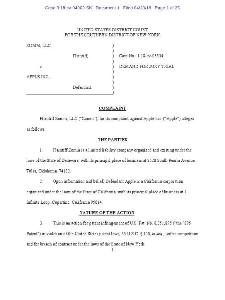 Plaintiff Zomm, LLC (“Zomm”), for its complaint against Apple Inc. (“Apple”) alleges