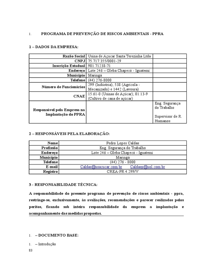 O presente PPRA foi elaborado com base na avaliação dos riscos existentes, ou que venham a