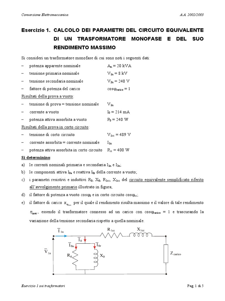 Esercizio 1 sui trasformatori Pag. 1 di 5