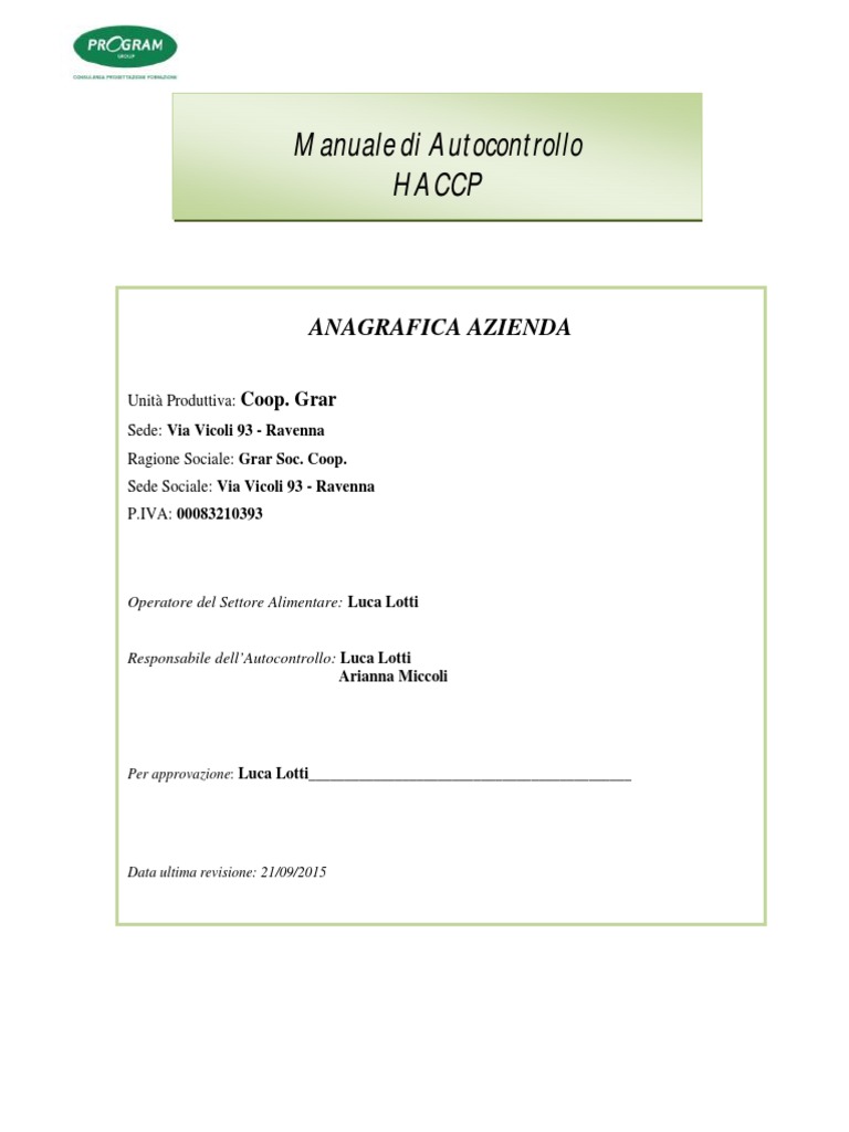 PIANO DI AUTOCONTROLLO H.A.C.C.P.