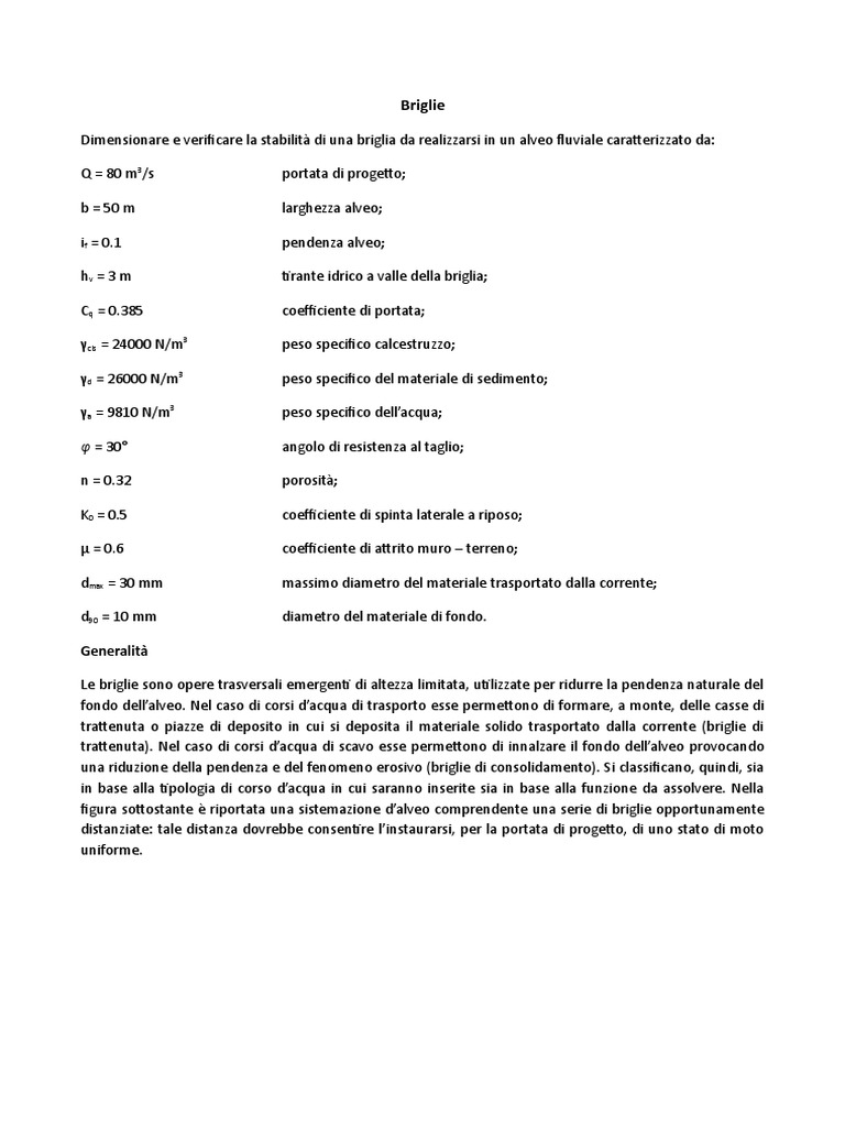 Dimensionare e verificare la stabilità di una briglia da realizzarsi in un alveo fluviale caratterizzato da: