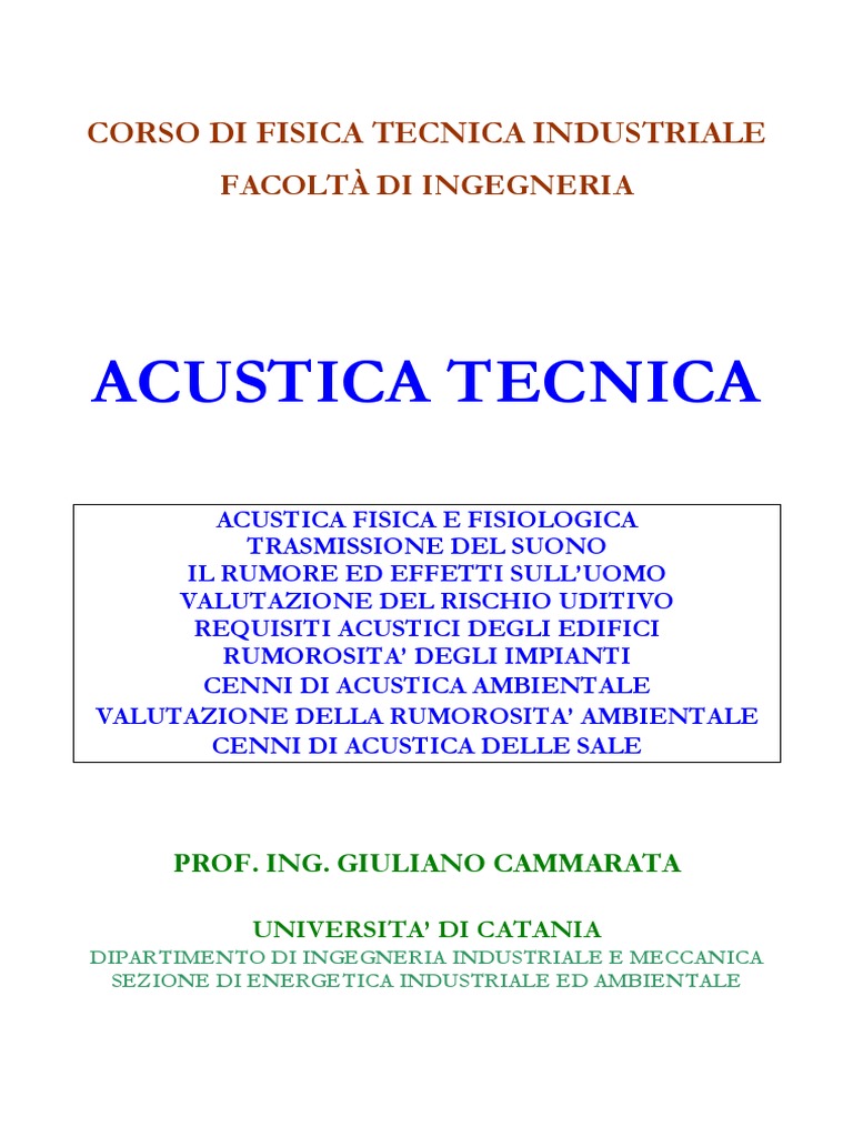l’Acustica Tecnica (nelle varie sue suddivioni: Acustica Fisica, Acustica Fisiologica, Acustica Ambientale, Acustica