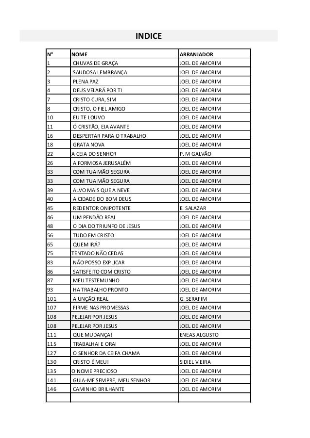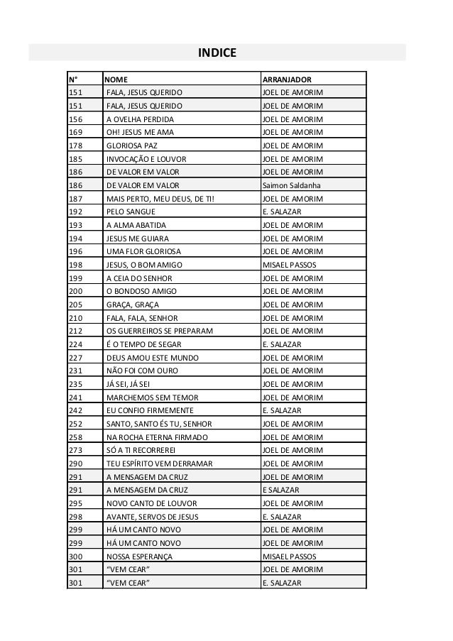 N° NOME ARRANJADOR INDICE 151 FALA, JESUS QUERIDO JOEL DE AMORIM 151 FALA, JESUS QUERIDO JOEL DE AMORIM 156 A OVELHA PERDI