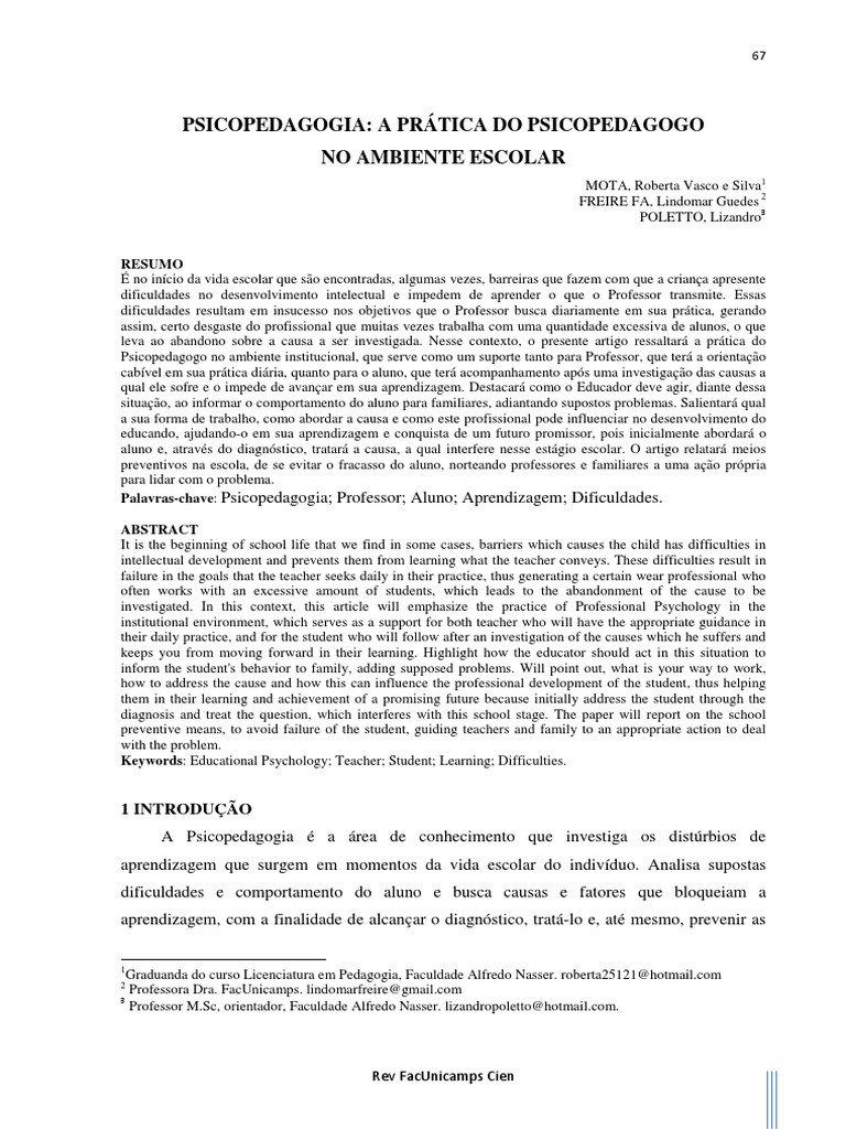 1 Graduanda do curso Licenciatura em Pedagogia, Faculdade Alfredo Nasser. roberta25121@hotmail.com 2 Professora Dra. FacUnicamps. lindomarfreire@gmail.com 3 Professor M.Sc, orientador, Faculdade Alfredo Nasser. lizandropoletto@hotmail.com.