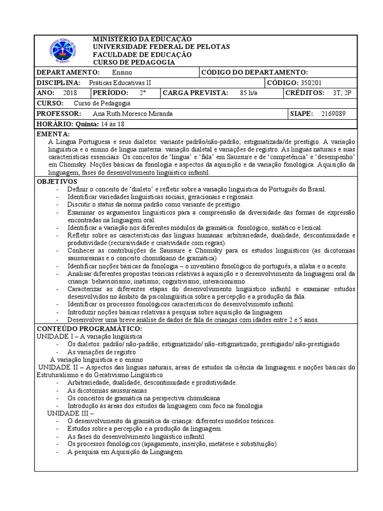 DISCIPLINA: Práticas Educativas II CÓDIGO: 350201