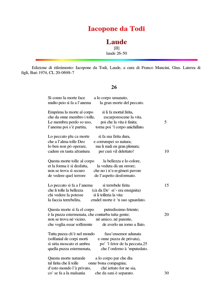 Edizione di riferimento: Iacopone da Todi, Laude, a cura di Franco Mancini, Gius. Laterza &