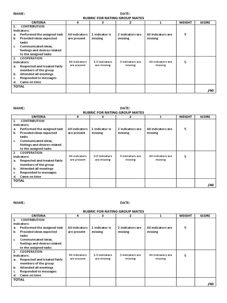 RUBRIC FOR RATING GROUP MATES