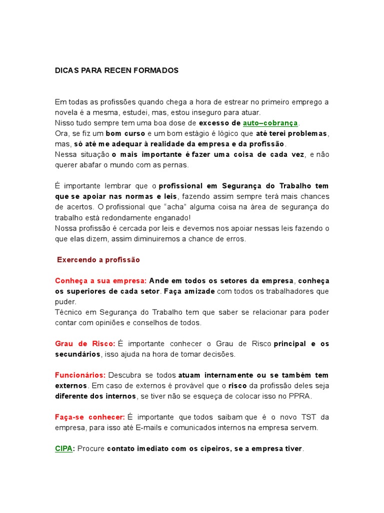 É importante lembrar que o profissional em Segurança do Trabalho tem