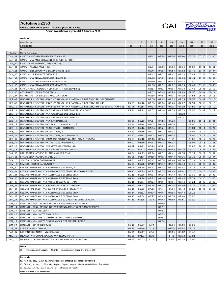 Autolinea Z150: Orario Scolastico in Vigore Dal 7 Gennaio 2019 Andata