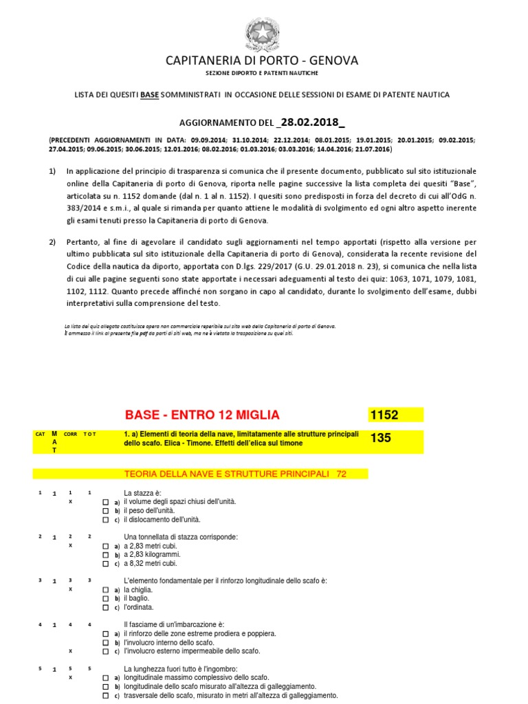 LISTA DEI QUESITI BASE SOMMINISTRATI IN OCCASIONE DELLE SESSIONI DI ESAME DI PATENTE NAUTICA