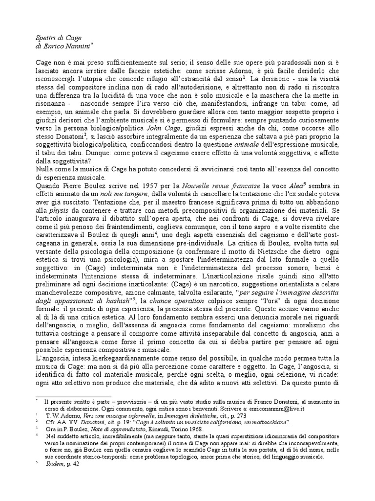 verso la nominazione dei propri contemporanei) il nome di Cage non appare mai: si direbbe che inconsapevolmente,