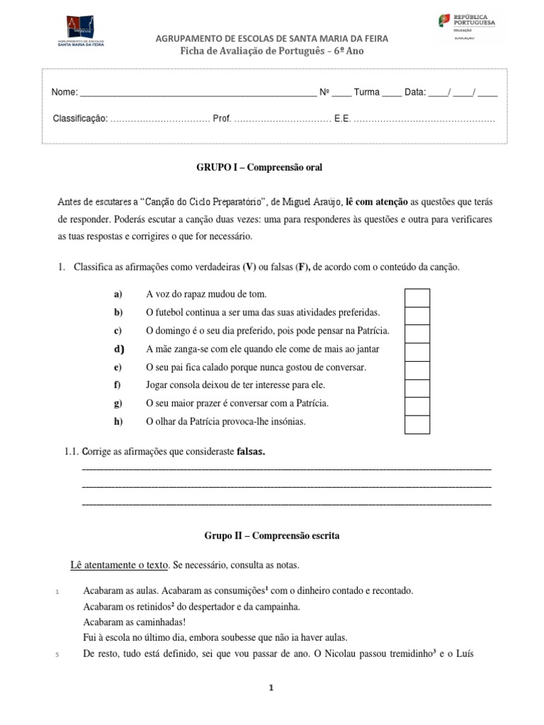Antes de escutares a “Canção do Ciclo Preparatório”, de Miguel Araújo, lê com atenção as questões que terás