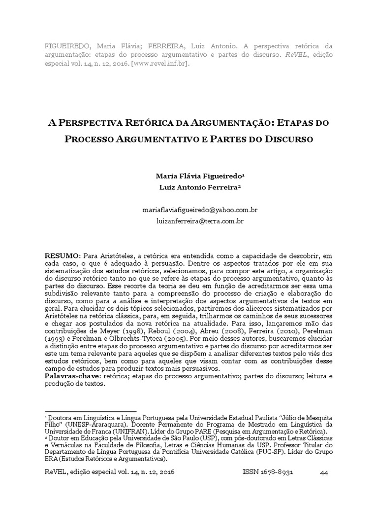 argumentação: etapas do processo argumentativo e partes do discurso. ReVEL, edição