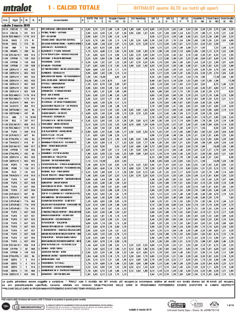 1 - CALCIO TOTALE INTRALOT quote ALTE su tutti gli sport