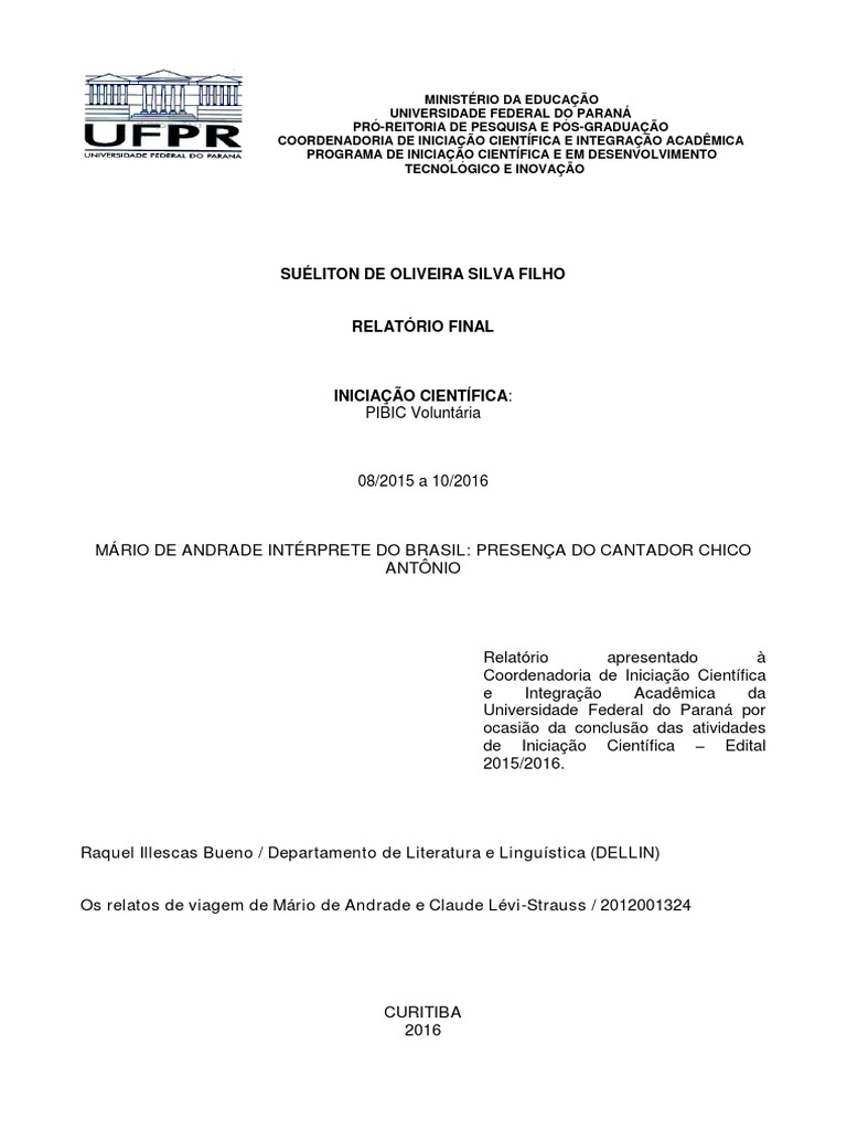 pesquisa: “Os relatos de viagem de Mário de Andrade e Claude Lévi-Strauss”.