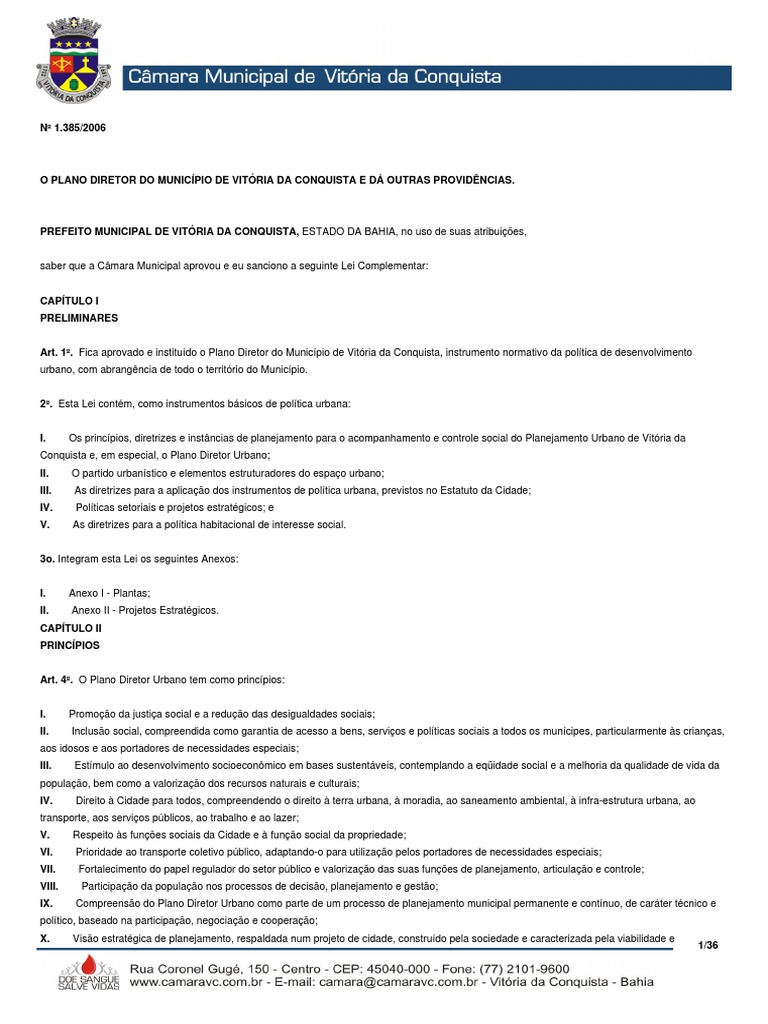 I. Os princípios, diretrizes e instâncias de planejamento para o acompanhamento e controle social do Planejamento Urbano de Vitória da Conquista e, em especial, o Plano Diretor Urbano;