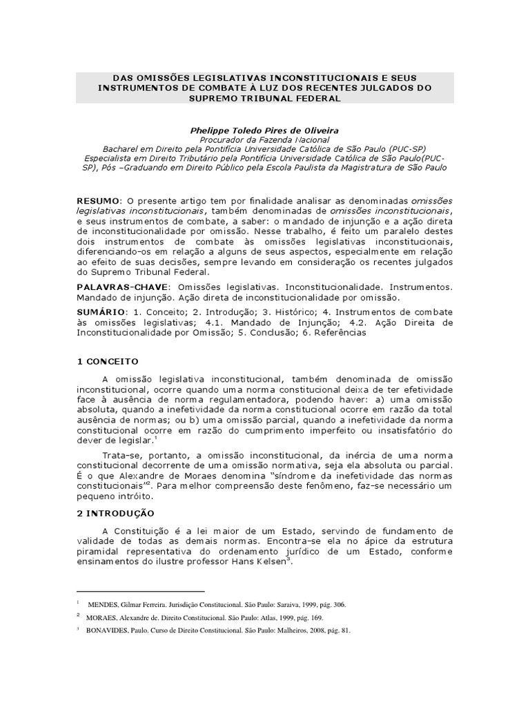 RESUMO: O presente artigo tem por finalidade analisar as denominadas omissões legislativas inconstitucionais, também denominadas de omissões inconstitucionais, e seus instrumentos de combate, a saber: o mandado de injunção e a ação direta de inconstitucionalidade por omissão. Nesse trabalho, é feito um paralelo destes dois instrumentos de combate às omissões legislativas inconstitucionais, diferenciando-os em relação a alguns de seus aspectos, especialmente em relação ao efeito de suas decisões, sempre levando em consideração os recentes julgados do Supremo Tribunal Federal.