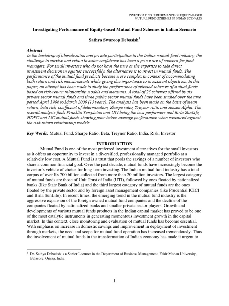 Key Words: Mutual Fund, Sharpe Ratio, Beta, Treynor Ratio, India, Risk, Investor
