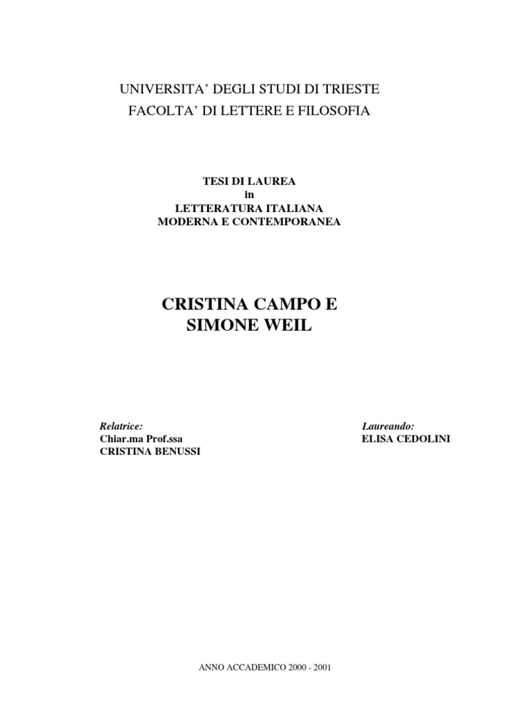 avere la ventura di imbattersi; prima fra tutte quella di Simone Weil, che seppi essere