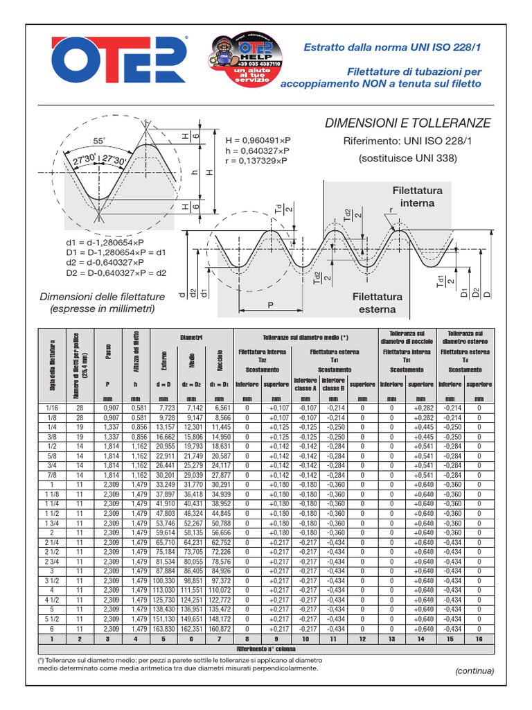55˚ H = 0,960491×P Riferimento: UNI ISO 228/1
