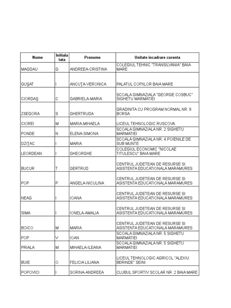 Nume Prenume Unitate incadrare curenta