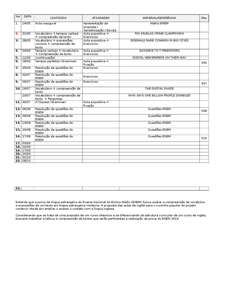 e expressões de um texto em língua estrangeira moderna. A proposta das aulas de inglês para o cursinho popular do projeto