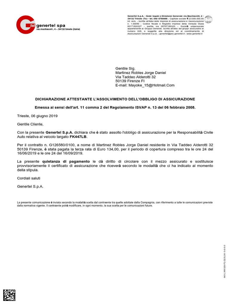 Con la presente Genertel S.p.A. dichiara che è stato assolto l'obbligo di assicurazione per la Responsabilità Civile