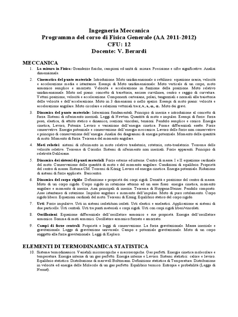 Programma del corso di Fisica Generale (AA 2011-2012)