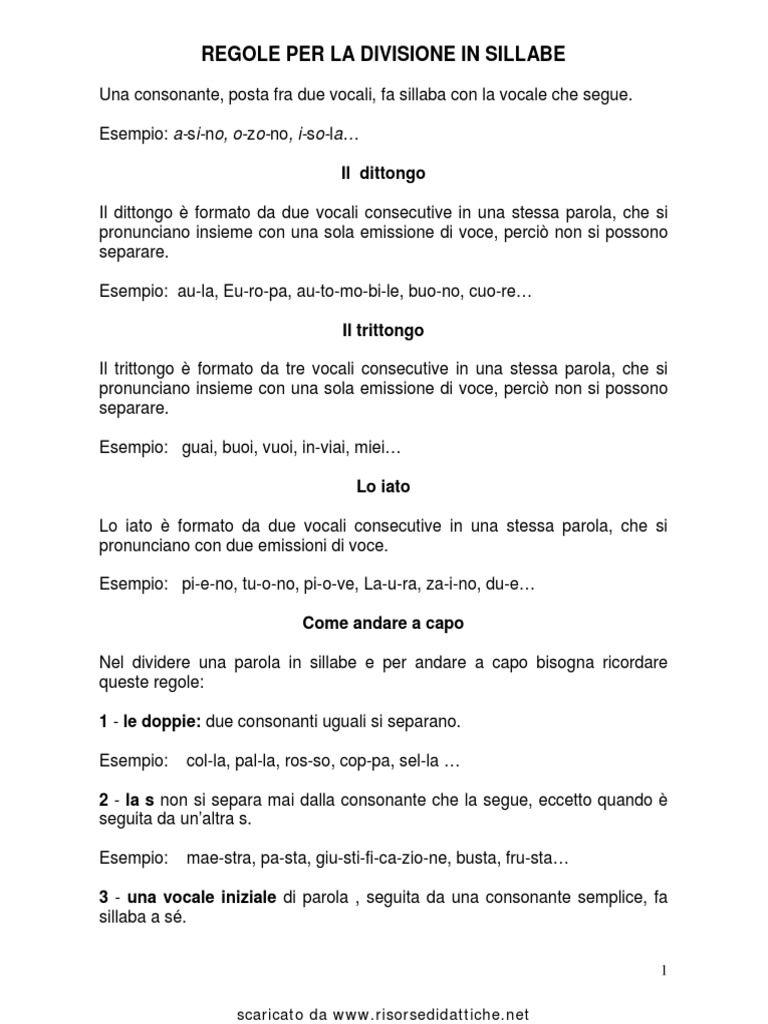 REGOLE PER LA DIVISIONE IN SILLABE