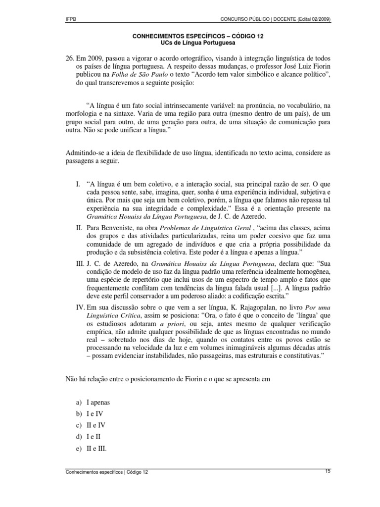 IV. Em sua discussão sobre o que vem a ser língua, K. Rajagopalan, no livro Por uma