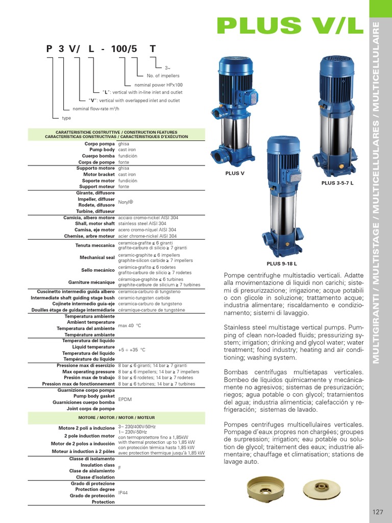 Max operating pressure 8 bar ≤ 6 impellers; 14 bar ≥ 7 impellers Bombas centrífugas multietapas verticales.