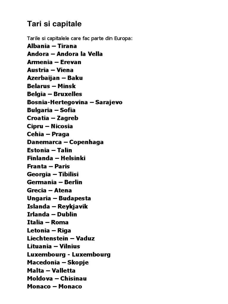 Tarile si capitalele care fac parte din Europa: