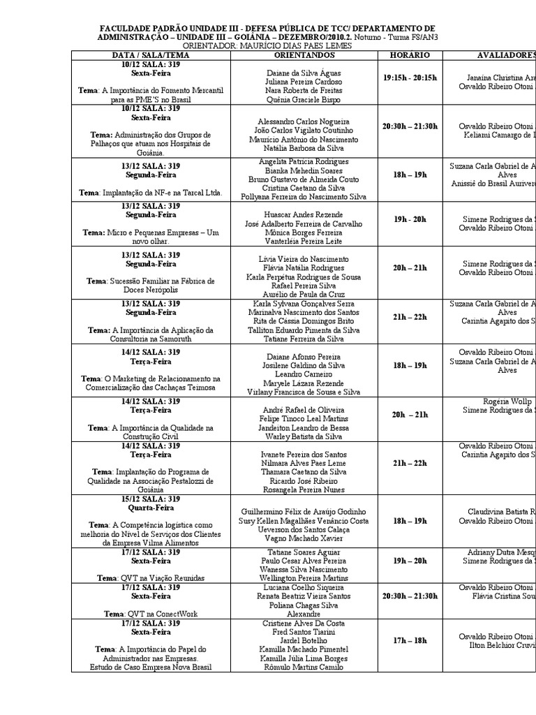 ADMINISTRAÇÃO – UNIDADE III – GOIÂNIA – DEZEMBRO/2010.2. Noturno - Turma F8/AN3