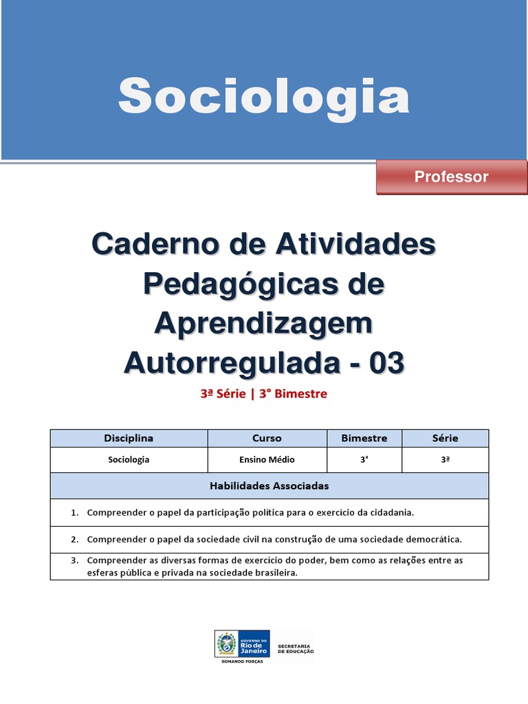 Neste caderno, você encontrará atividades diretamente relacionadas a algumas habilidades e competências do 3° Bimestre do Currículo Mínimo de Sociologia da 3ª Série do Ensino Médio. Estas atividades correspondem aos estudos durante o período de um mês. A nossa proposta é que você atue como tutor na realização destas atividades com a turma, estimulando a autonomia dos alunos nessa empreitada, mediando as trocas de conhecimentos, reflexões, dúvidas e questionamentos que venham a surgir no percurso. Esta é uma ótima oportunidade para você estimular o desenvolvimento da disciplina e independência indispensáveis ao sucesso na vida pessoal e profissional de nossos alunos no mundo do conhecimento do século XXI. Neste Caderno de Atividades, o aluno vai refletir sobre o processo de construção da cidadania e de produção de direitos na vida social. Estima-se que o aluno perceba distintas maneiras de exercício de poder, tomando o homem como sujeito e objeto do poder. Ademais, há o intuito que o tema do sentido da democracia seja discutido apreciando a inserção das massas na vida política em seus diversos níveis de participação. Para os assuntos abordados em cada bimestre, vamos apresentar algumas relações diretas com todos os materiais que estão disponibilizados em nosso portal eletrônico Conexão Professor, fornecendo diversos recursos de apoio pedagógico para o Professor Tutor. Este documento apresenta 03 (três) aulas. As aulas podem ser compostas por uma explicação base, para que você seja capaz de compreender as principais ideias relacionadas às habilidades e competências principais do bimestre em questão, e atividades respectivas. Leia o texto e, em seguida, resolva as Atividades propostas. As Atividades são referentes a um tempo de aula. Para reforçar a aprendizagem, propõe- se, ainda, uma avaliação e uma pesquisa sobre o assunto.