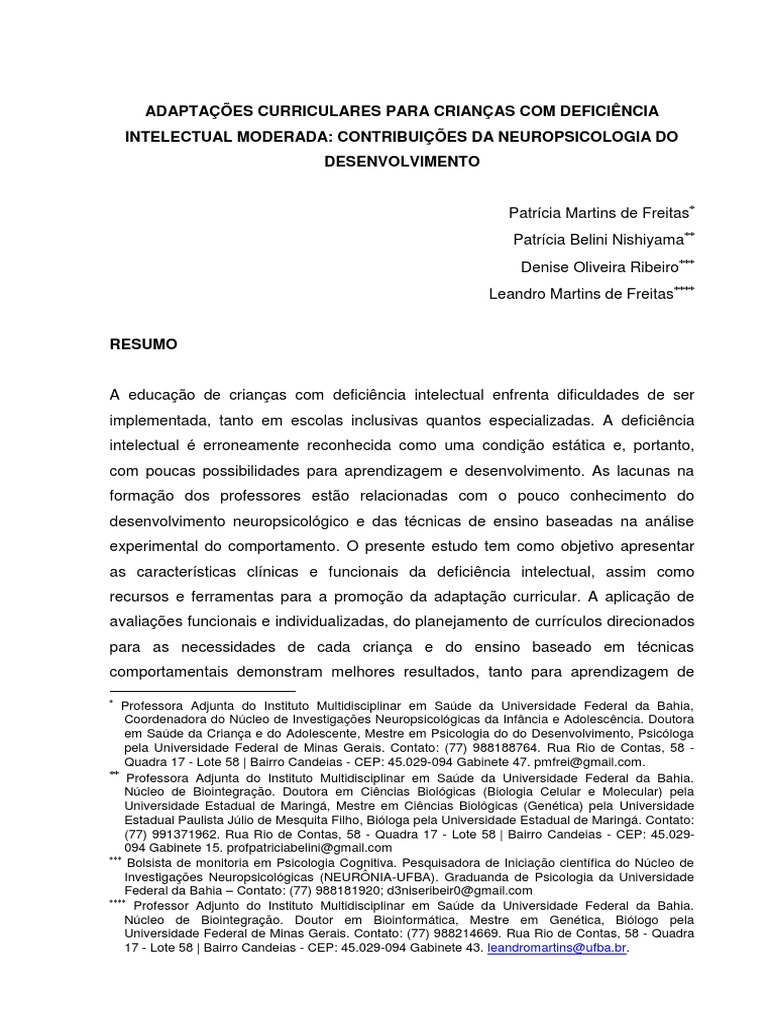 Palavras-chave: Deficiência intelectual. Adaptação curricular Neuroplasticidade. Genética. Neuropsicologia do Desenvolvimento.