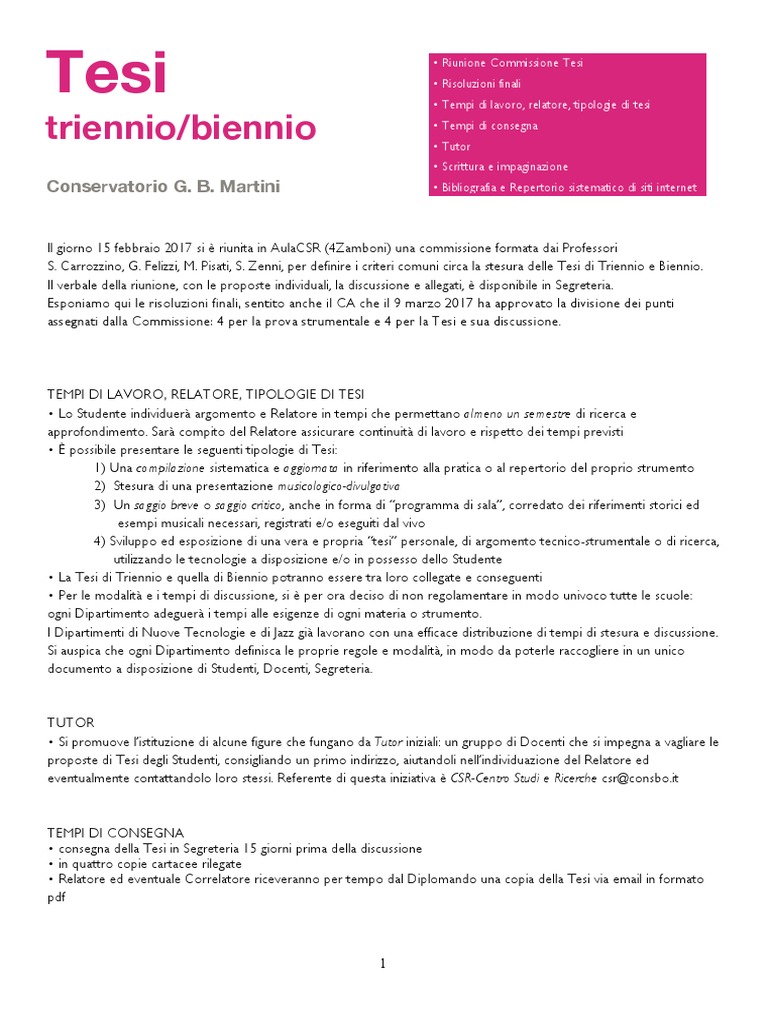 • Frontespizio: Conservatorio G. B. Martini, Bologna; Titolo e Sottotitolo Tesi; riportare l’indicazione: “Tesi di Diploma